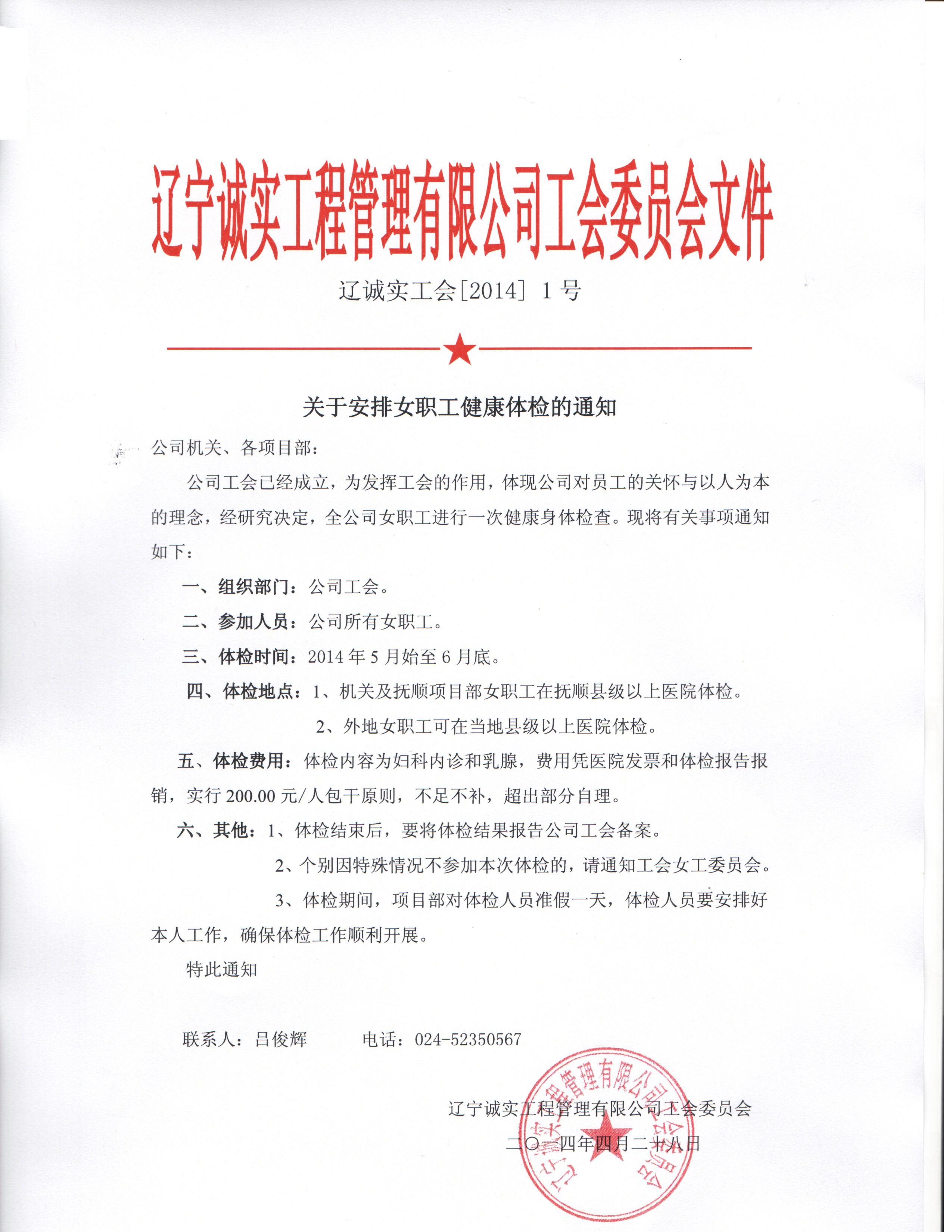 誠實(shí)工會將組織全體女職工于2014年5月底至6月底期間進(jìn)行健康體檢